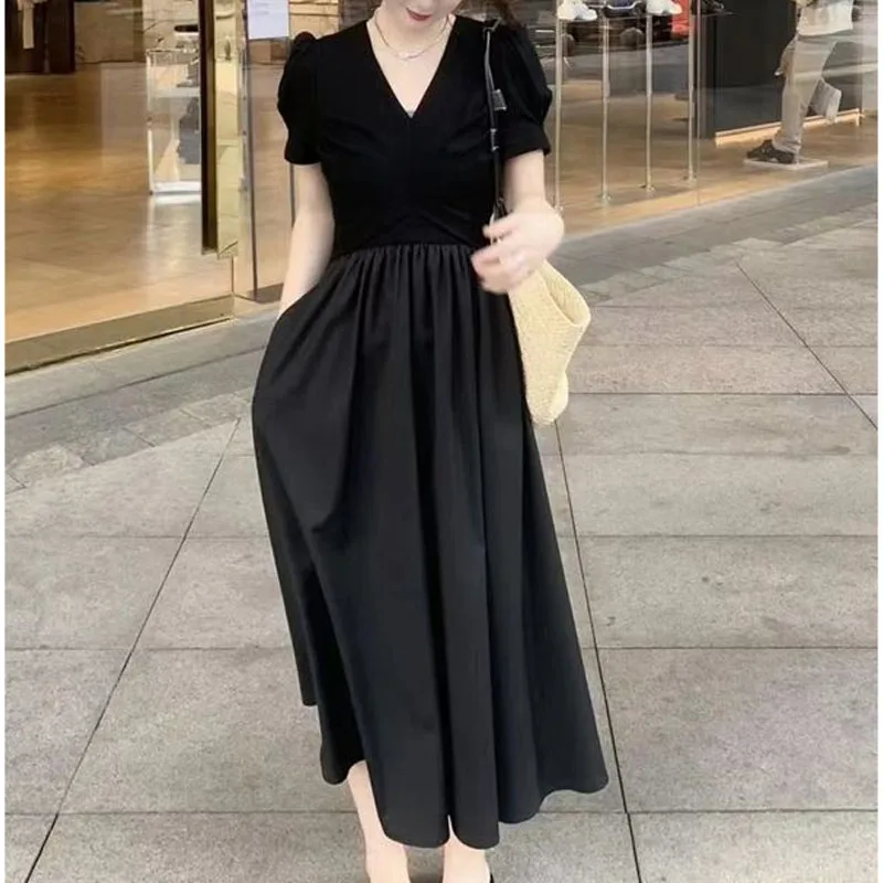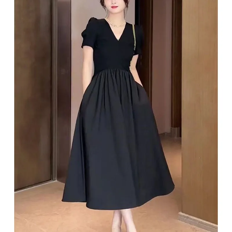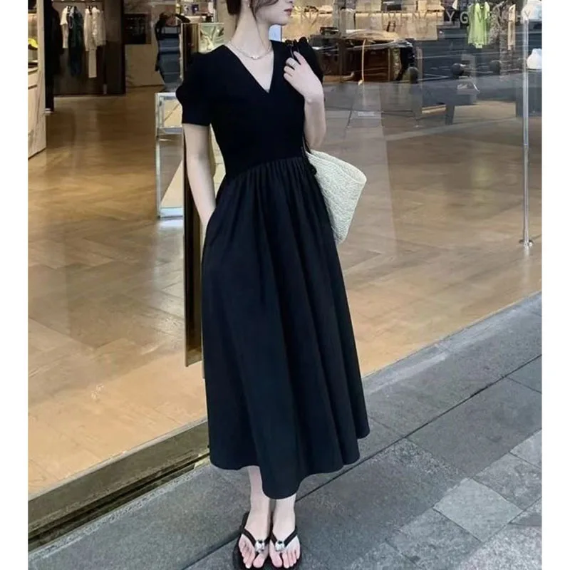 Minimalist Women's A-Line 2024 Summer New V-Neck Spliced Folds Elegant Fashion Casual Commuter Short Sleeve Slim Pockets Dress