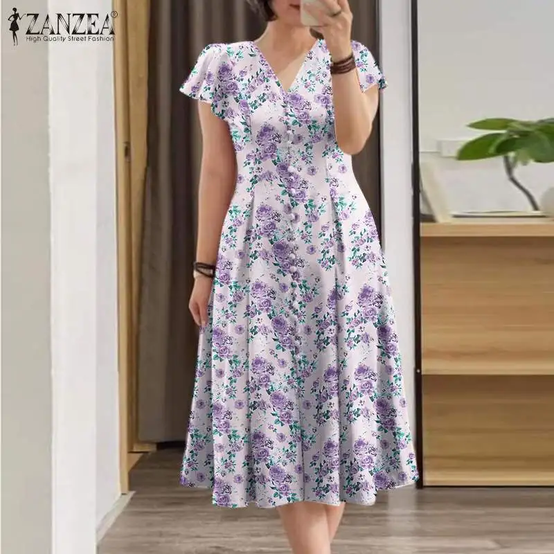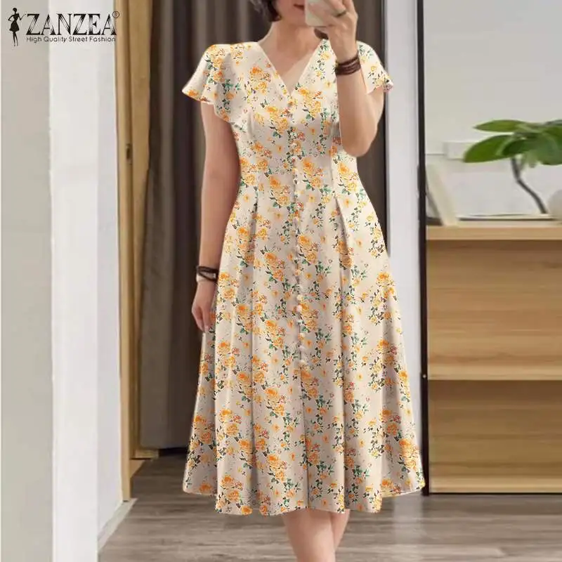 Summer Elegant Dress ZANZEA Fashion V Neck Short Sleeve Party Robe Women Bohemain Printed Sundress Casual Work OL Vestidos 2024