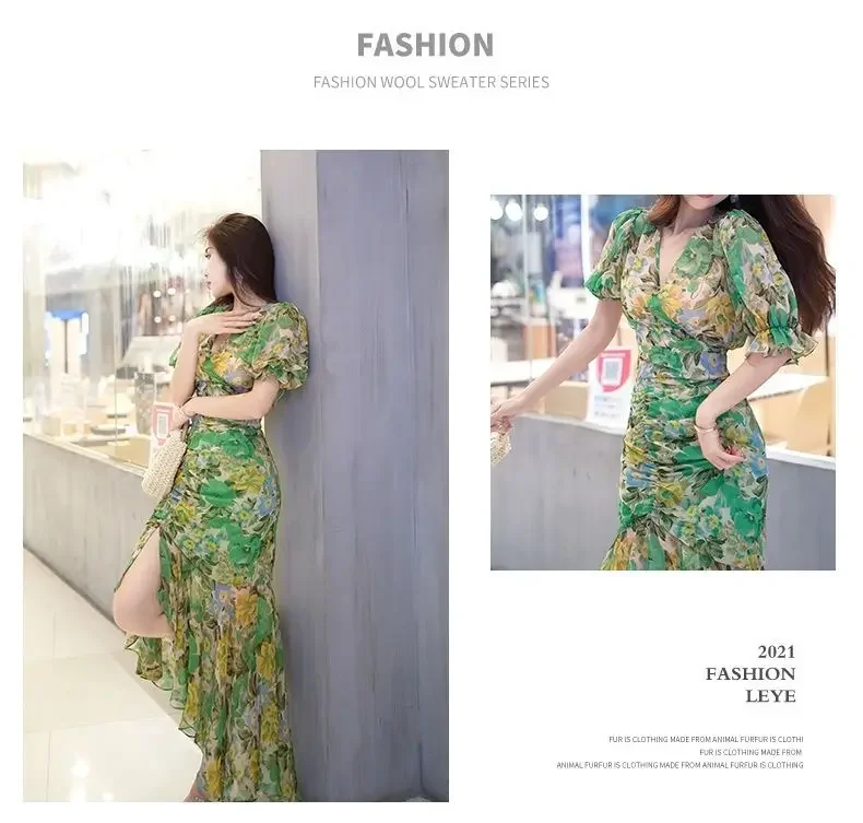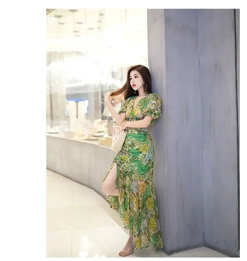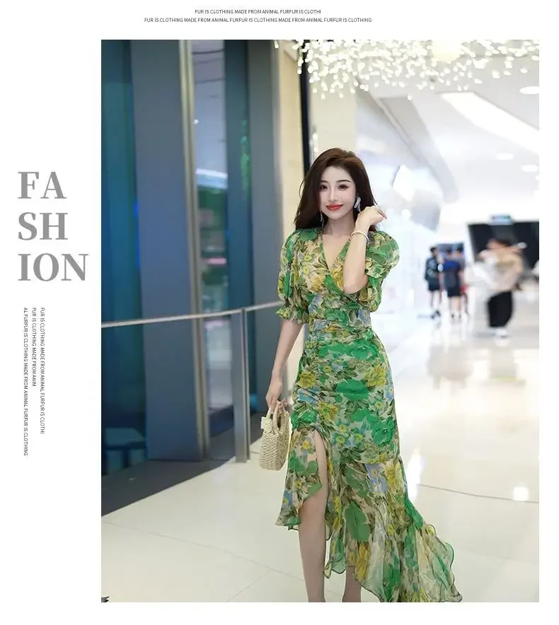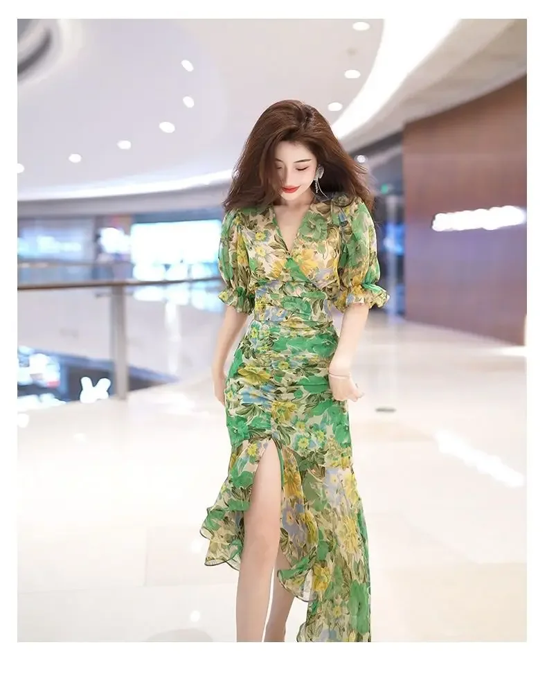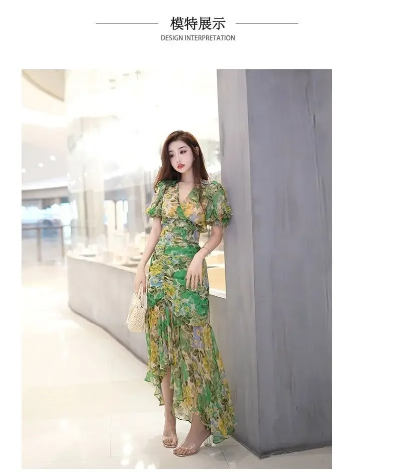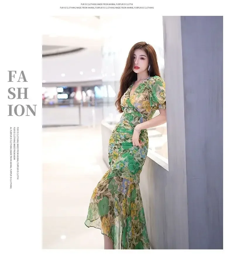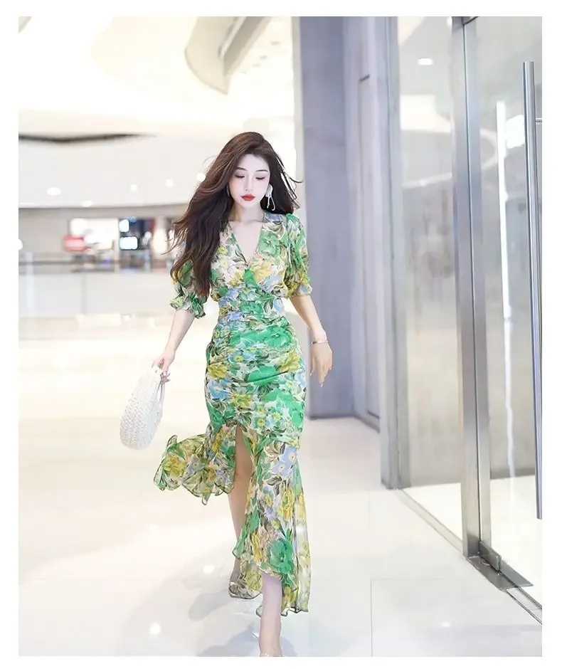 New Summer Fashion Style Waist-hugging Dress 2025 Dark Green Printed Skirt