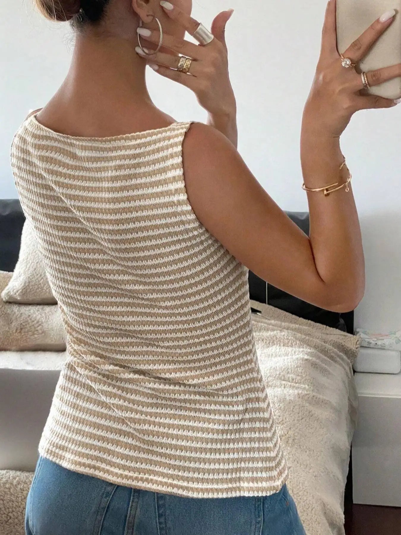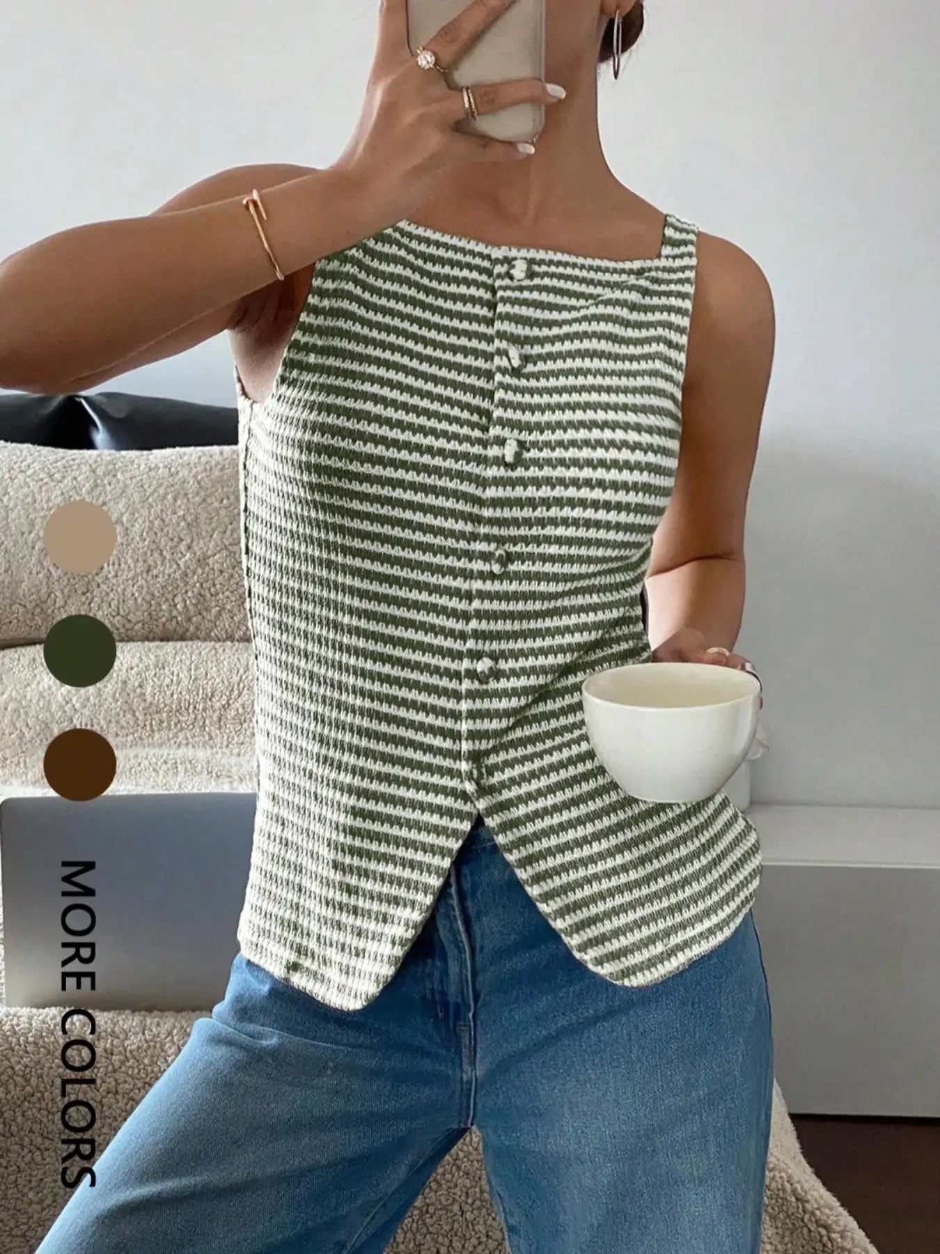 Women's Striped Button-Up Vest Casual Sleeveless Semi-Transparent Top Versatile Daily Wear for Ladies
