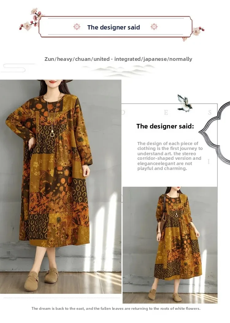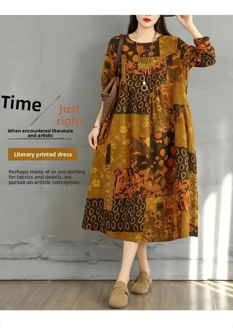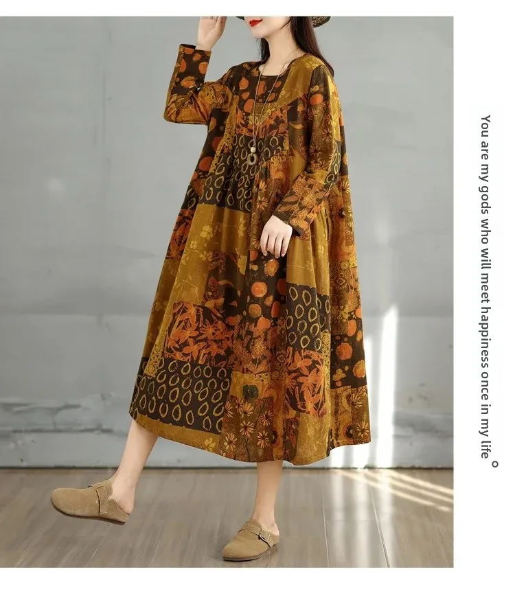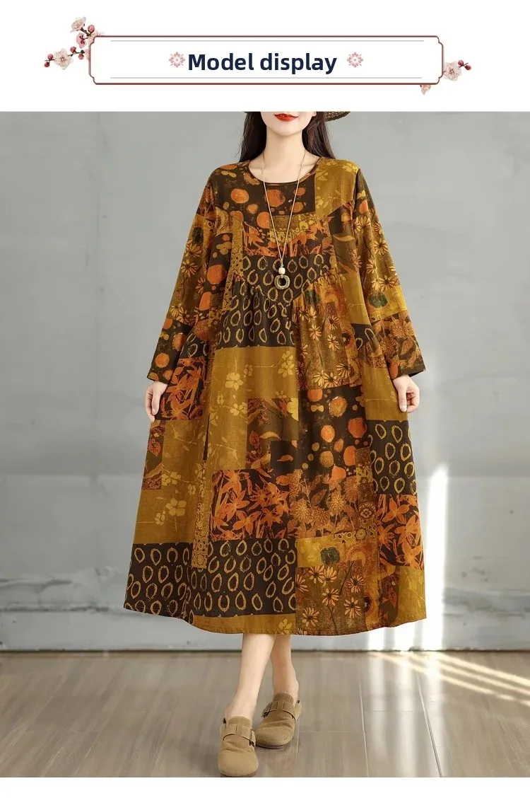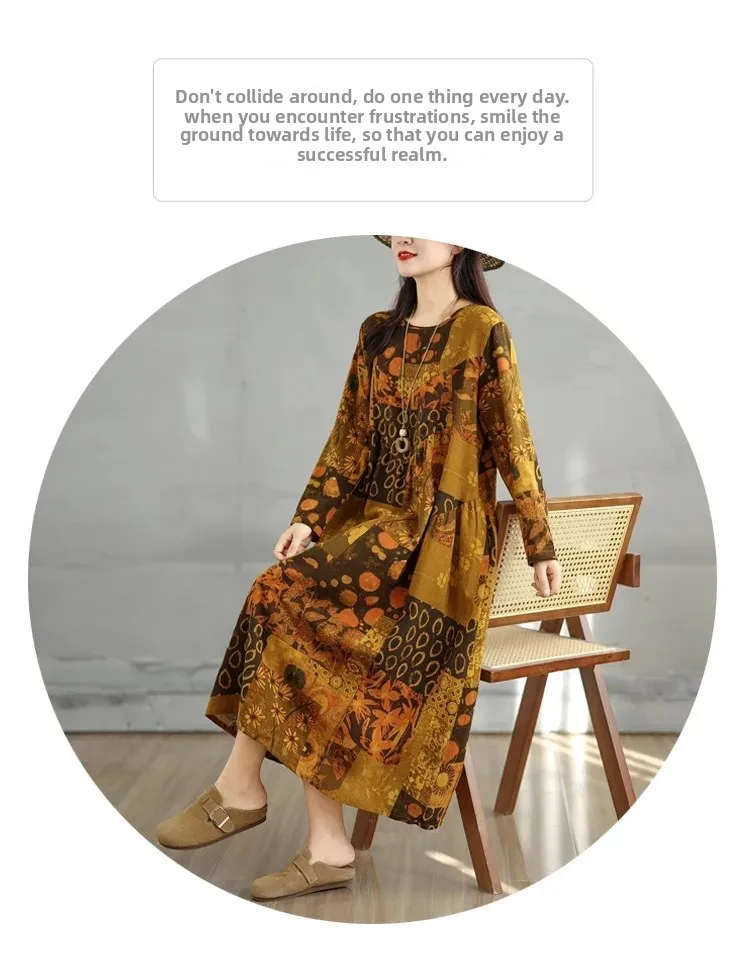 Vintage Print Round Neck Maxi Dress Women Loose Plus Size A-Line Skirt Fall New Arrival