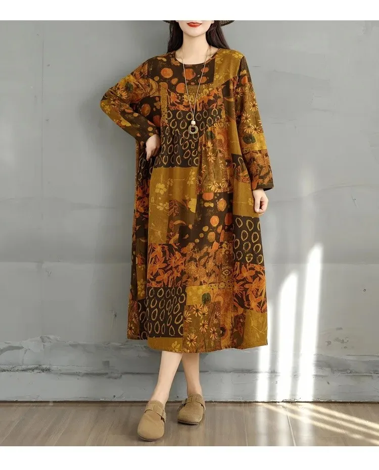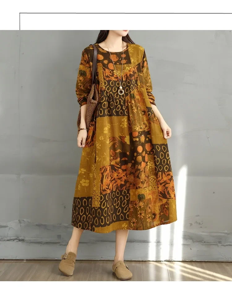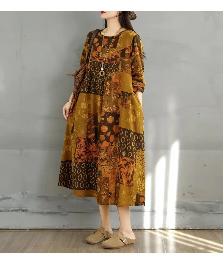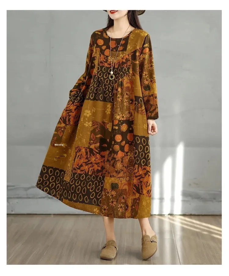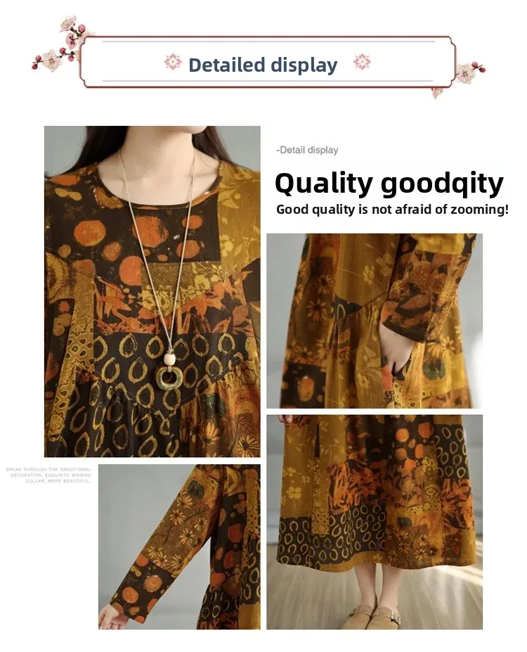Vintage Print Round Neck Maxi Dress Women Loose Plus Size A-Line Skirt Fall New Arrival