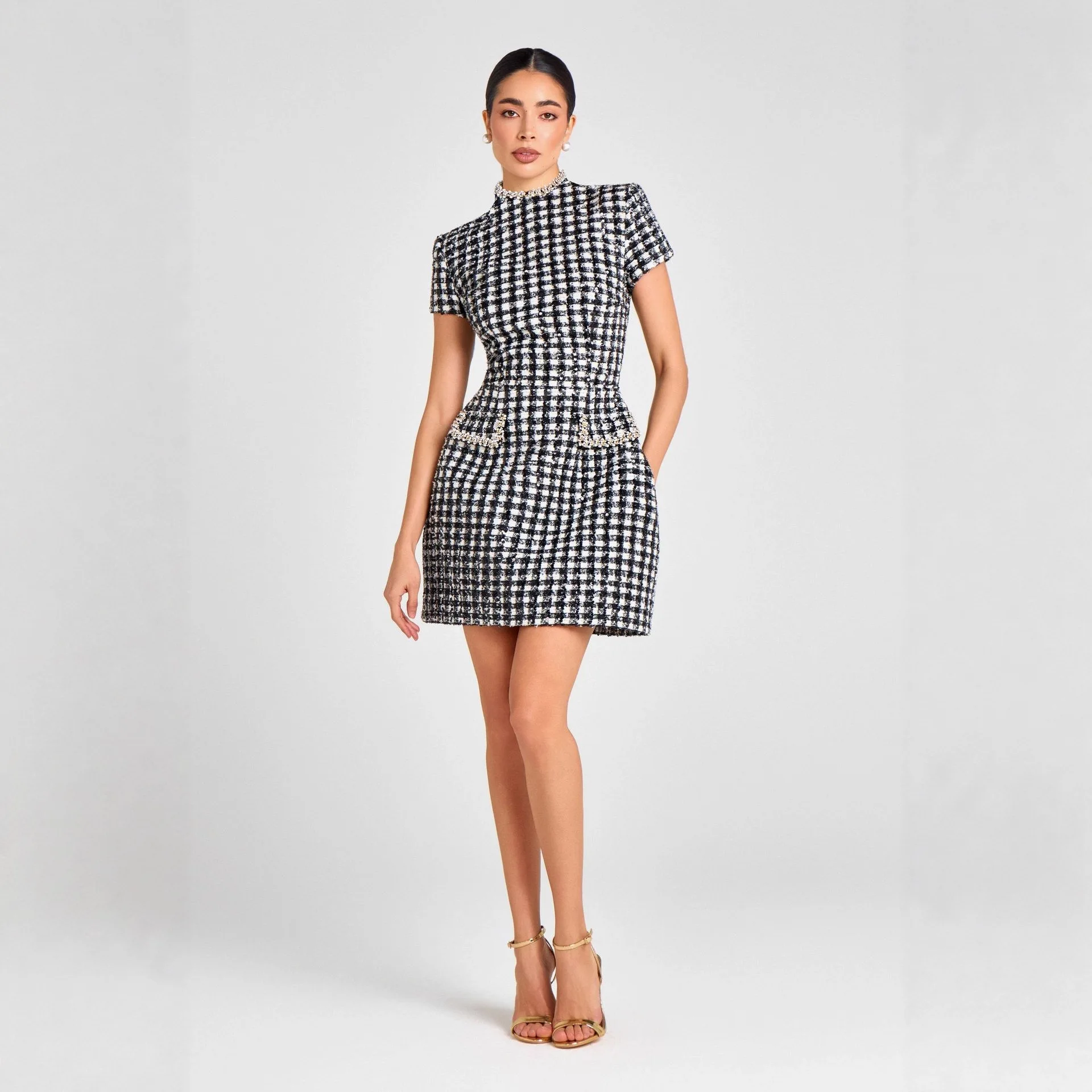 Black And White Plaid Slim Mini Dresses Women Temperament Elegant Bodycon Party Banquet Short Dress Lady Short Sleeves Vestidos