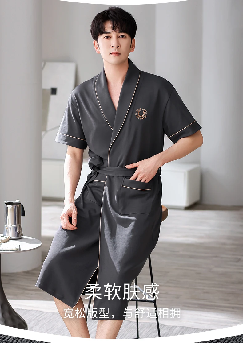 Apbrae New Summer Men's Soft Cotton Bathrobe Dark Grey Half Sleeve Solid Robe Big Size 4XL Fashion Elegant Kimono for Gentleman