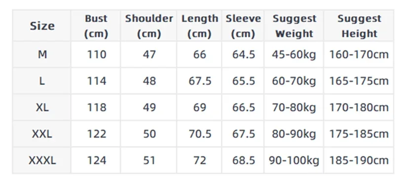size_info: {"sizeInfoList":[{"length":{"cm":"(CM)","inch":"(CM)"},"size":"AASIA SUURUS","vid":-87},{"length":{"cm":"140-150","inch":"55.12-59.06"},"size":"S","vid":-88},{"length":{"cm":"150-165","inch":"59.06-64.96"},"size":"M","vid":-89},{"length":{"cm":"165-170","inch":"64.96-66.93"},"size":"L","vid":-90},{"length":{"cm":"170-175","inch":"66.93-68.90"},"size":"XL","vid":-91},{"length":{"cm":"175-180","inch":"68.90-70.87"},"size":"XXL","vid":-92},{"length":{"cm":"180-185","inch":"70.87-72.83"},"size":"XXXL","vid":-93},{"length":{"cm":"185-190","inch":"72.83-74.80"},"size":"4XL","vid":-94},{"length":{"cm":"190-195","inch":"74.80-76.77"},"size":"5XL","vid":-95},{"length":{"cm":"195-200","inch":"76.77-78.74"},"size":"6XL","vid":-96}]}
