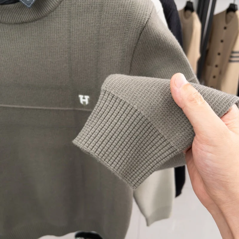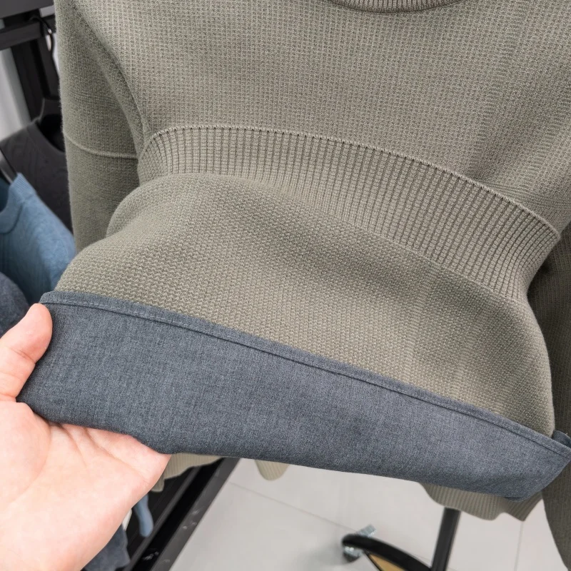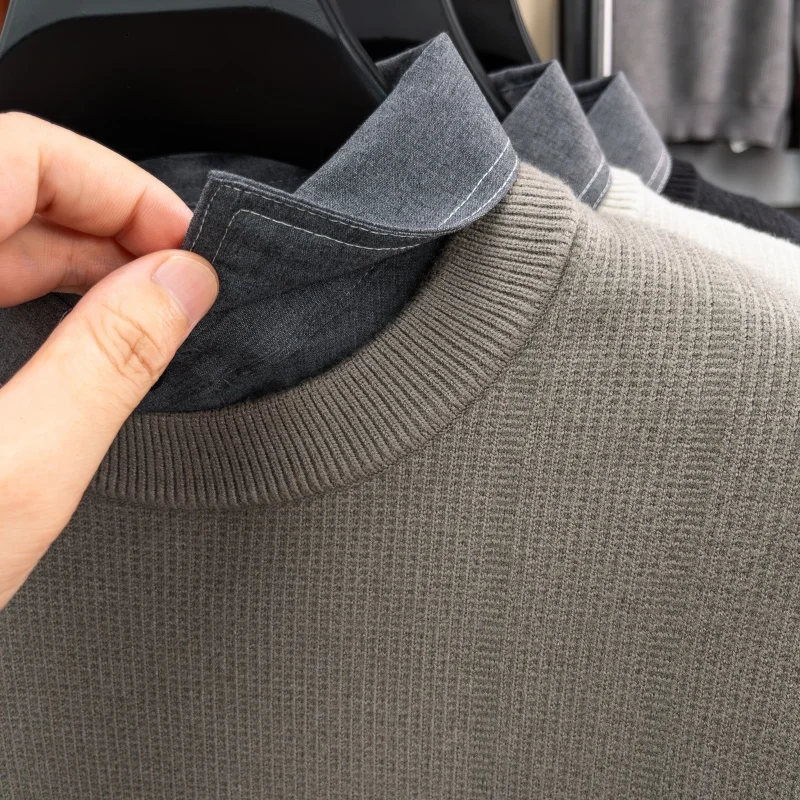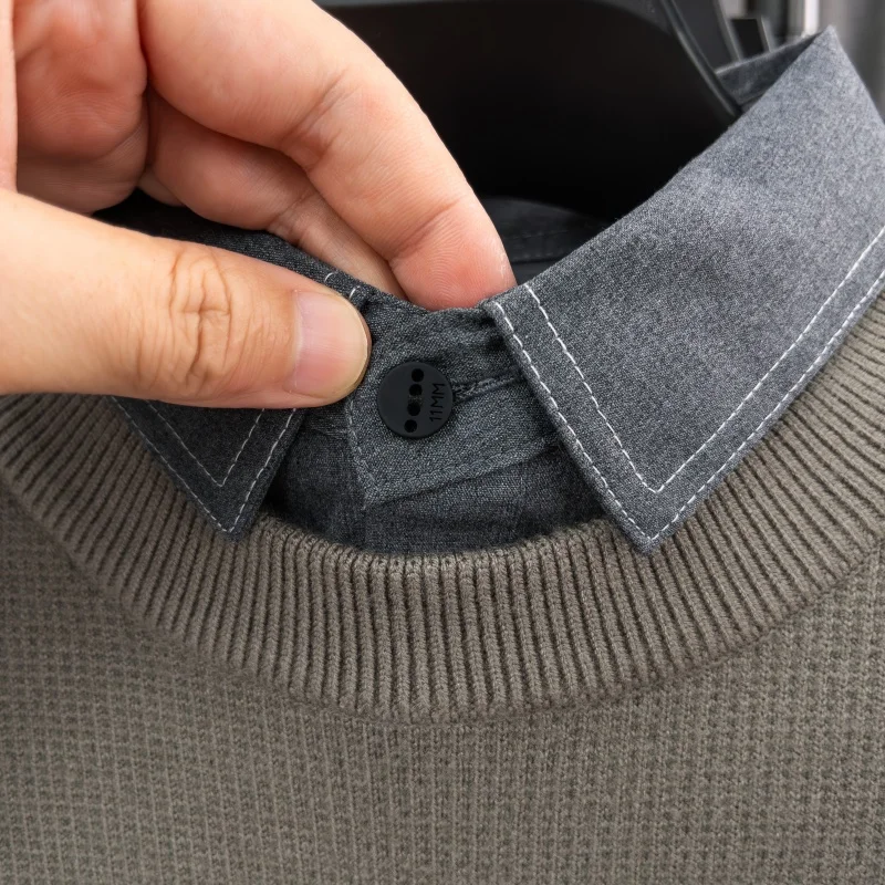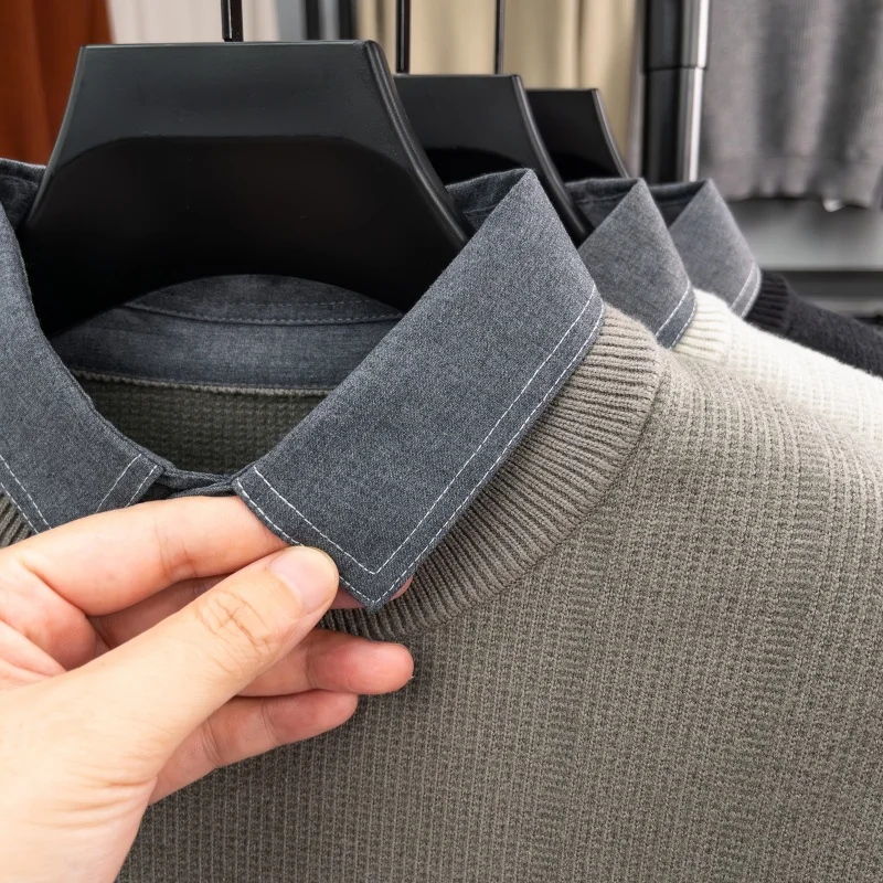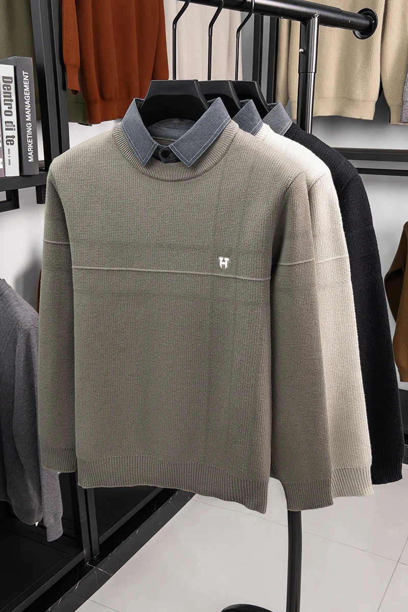 Trendy mens knit sweater featuring a stylish fake two piece layered design, creating a modern and chic look. Crafted with soft warm knit fabric for lasting comfort and durability. Perfect for autumn and winter seasons, suitable for both casual outings and semi-formal business occasions, offering versatility and fashion.