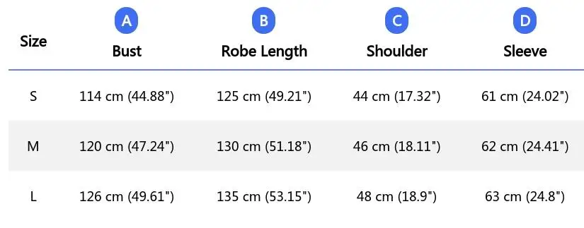 Size L: Bust 126 cm (49.61''), Robe Length 135 cm (53.15''), Shoulder 48 cm (18.9''), Sleeve 63 cm (24.8'')