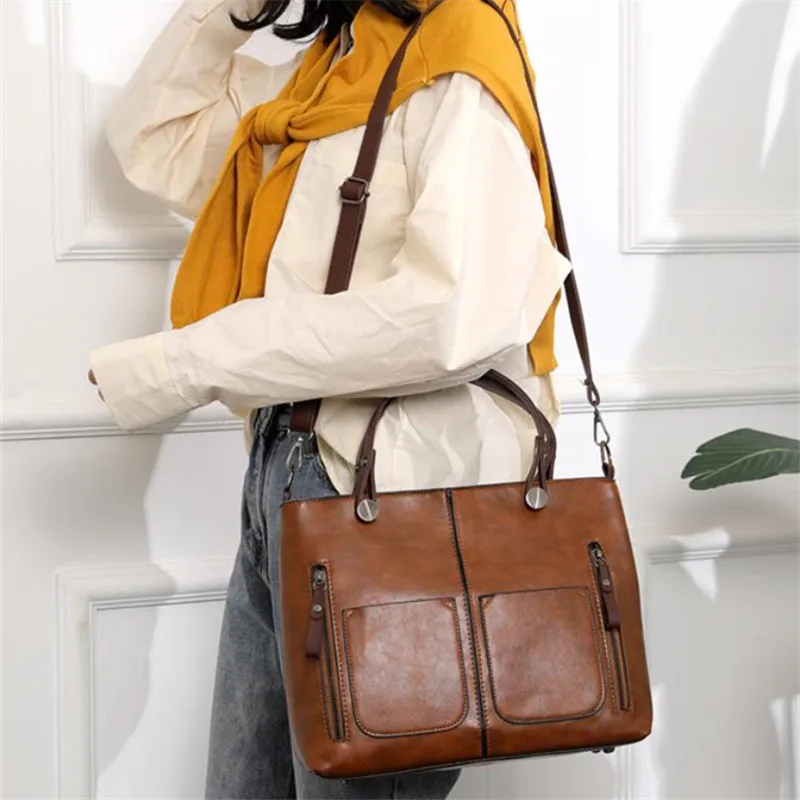 Europe America Retro Leather Handbag Shoulder Bag, Two Pocket Zipper Tote Bag, Classic Crossbody Bags for Women Work Business
