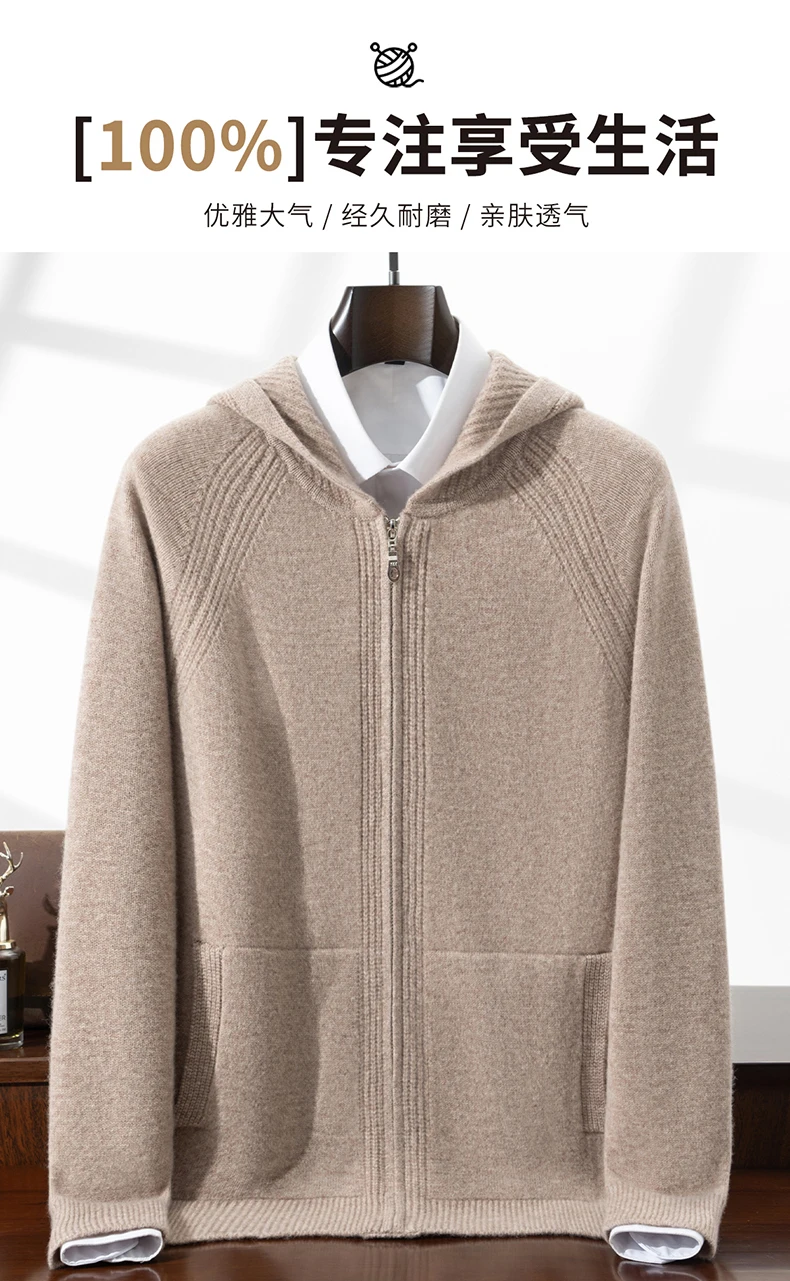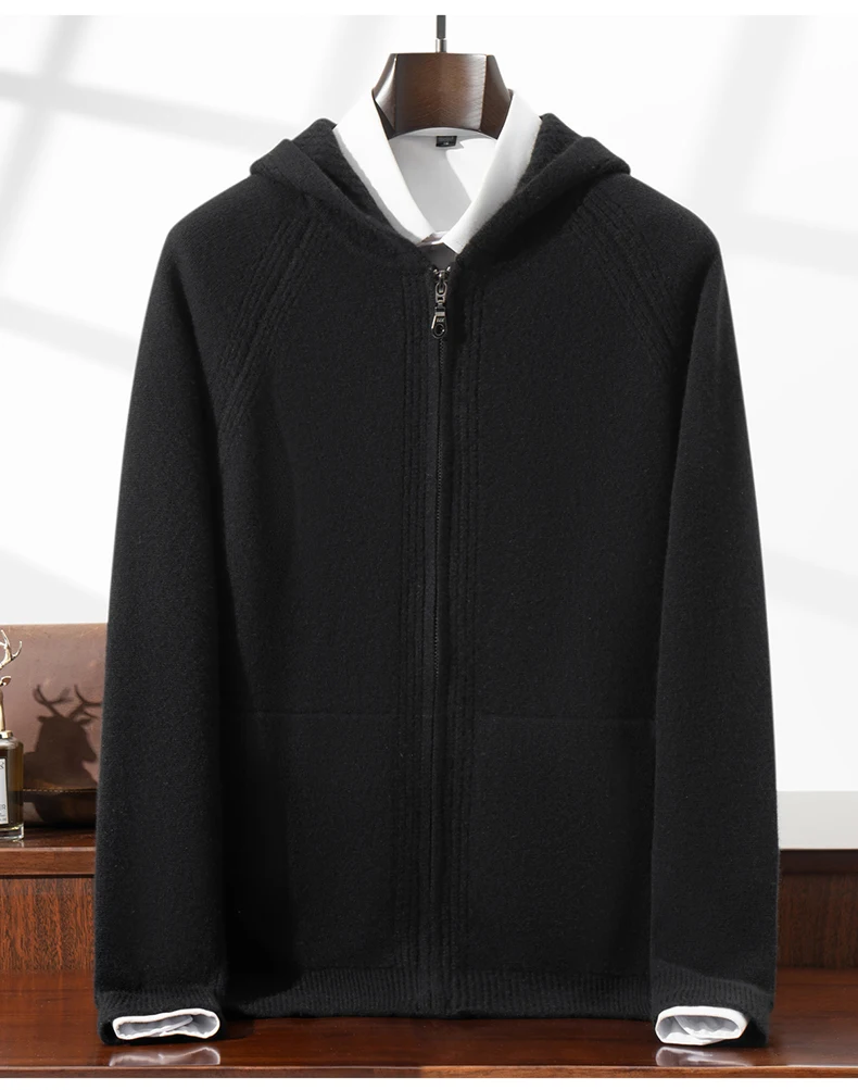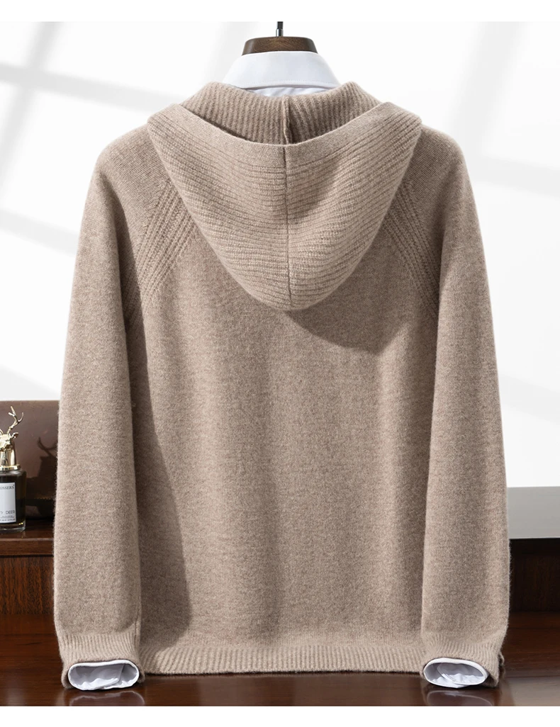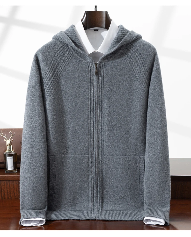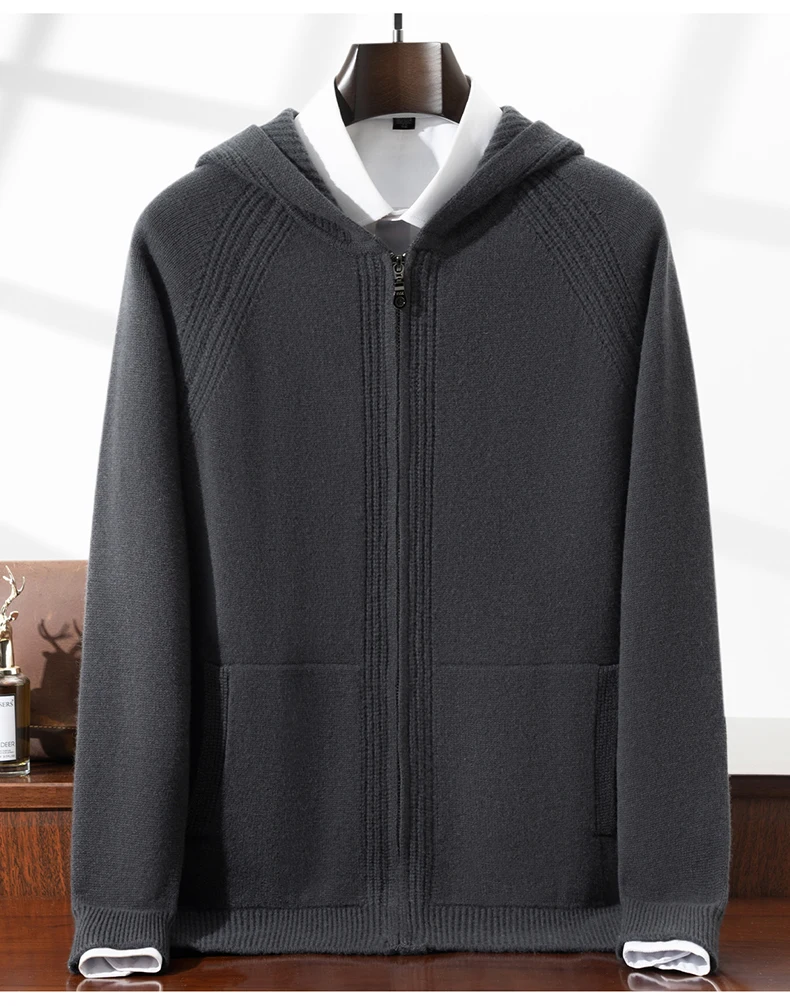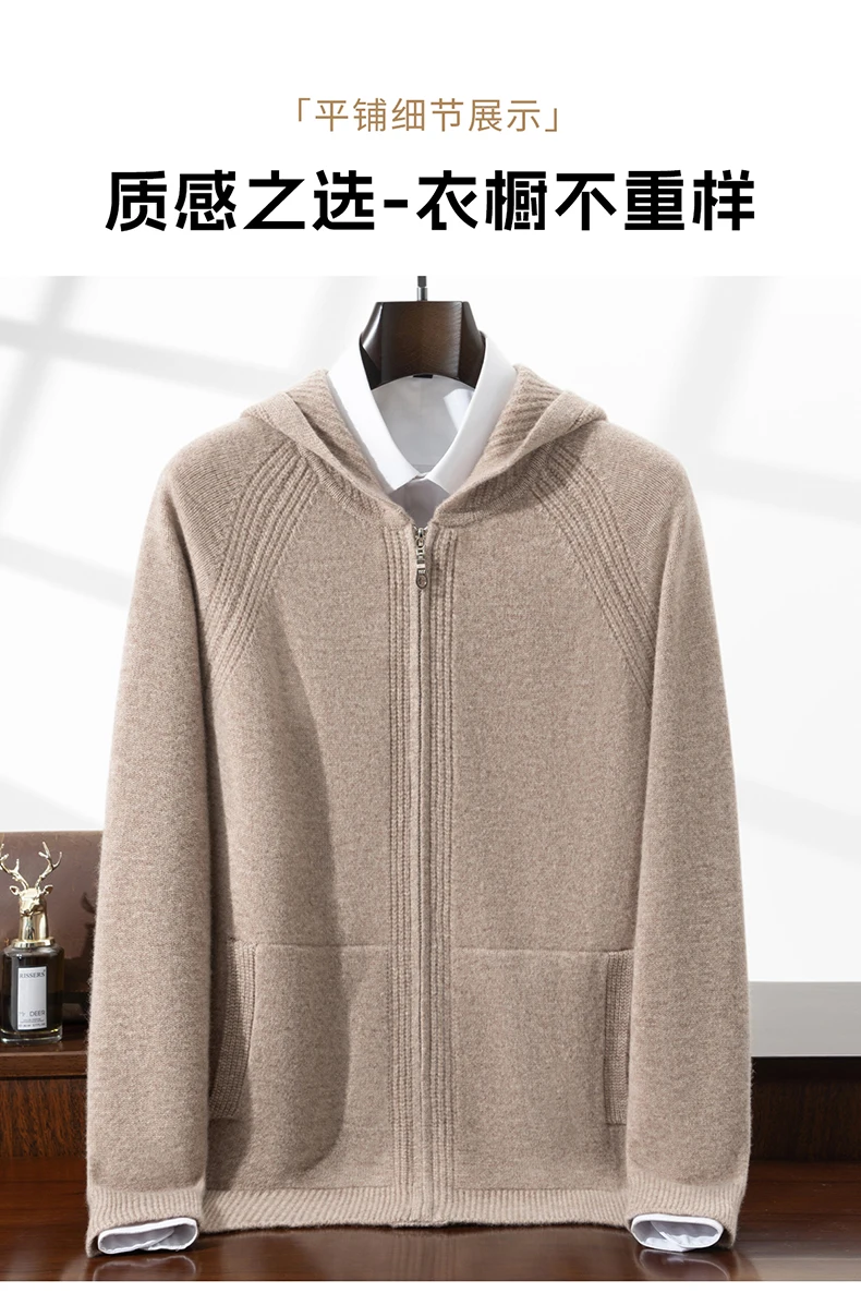 Autumn Winter New 100% Pure Wool Cardigan Men Hooded Thickened Pocket Sweater Loose Knitted Hoodie Cashmere Coat