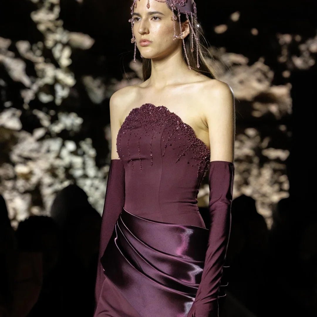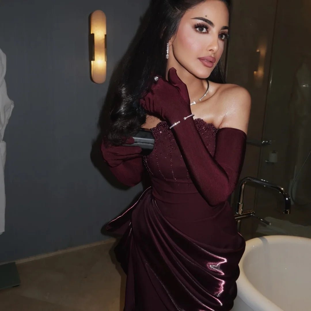 Bella Customized Burgundy Strapless Prom Dress Sequin Bodice Satin Draped Mermaid Floor Length With Long Gloves robes de soirée