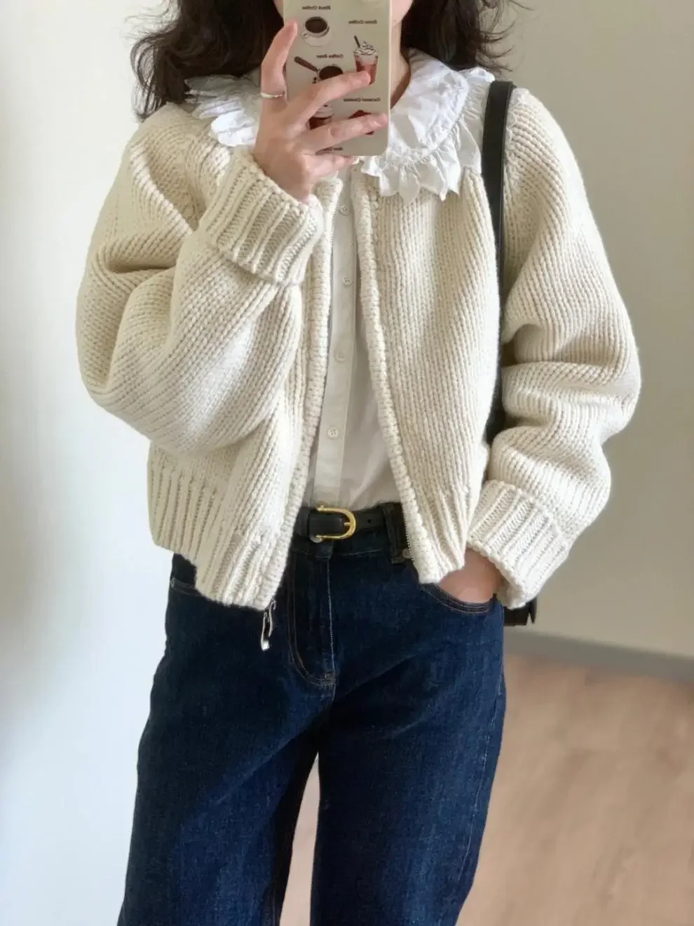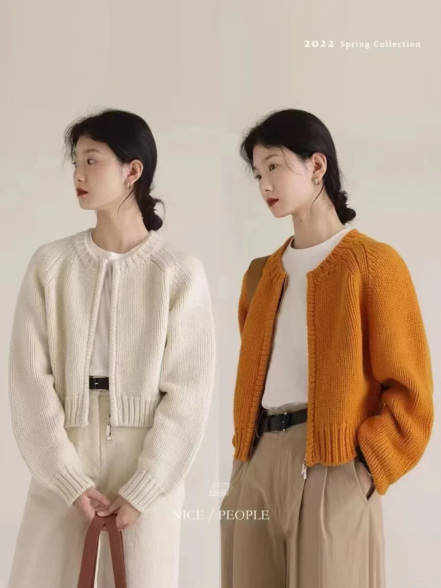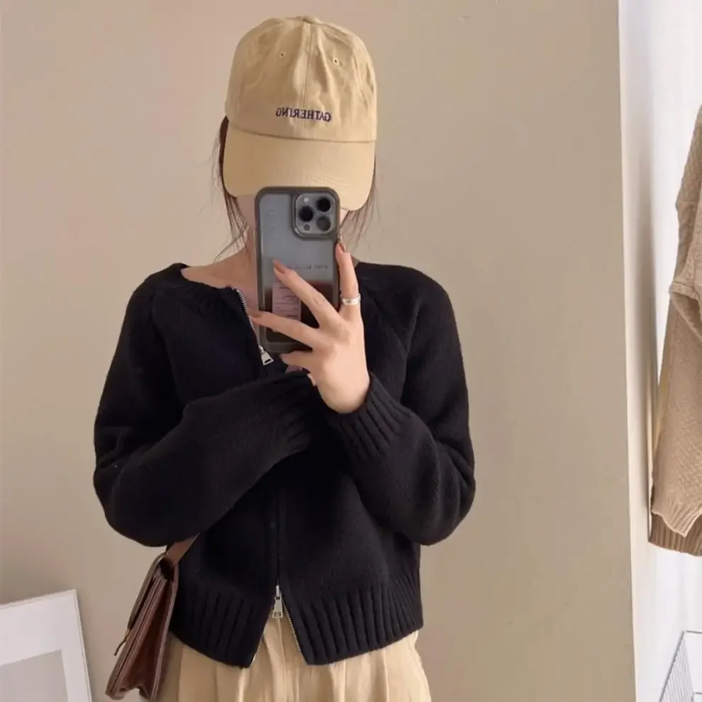 Korean Style Double Zip Women's Elegant Green Knitted Cardigan Slimming Versatile Cropped Sweater Crew Neck Outerwear