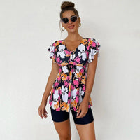 Swimsuit ta' Angolu Ħafif Kbir b'Fjura Stampata Tankini Konservattiv għan-Nisa Żewġ Biċċiet Swimwear Femminili Set Bikini għas-Sajf Mujer Biquini